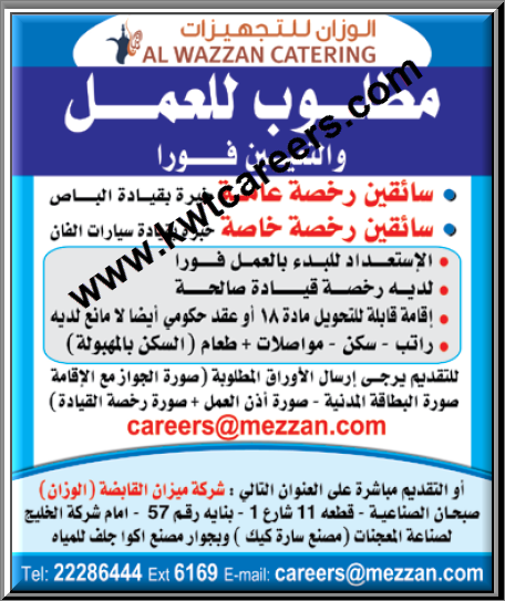 تعلن شركة الوزان للتجهيزات بالكويت حاجتها لسائقين رخصة عامة وخاصة الاثنين 17 ابريل 2017